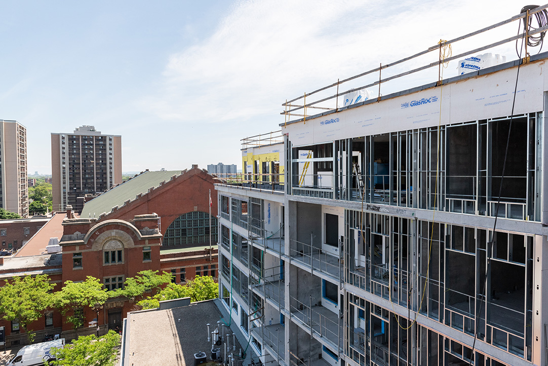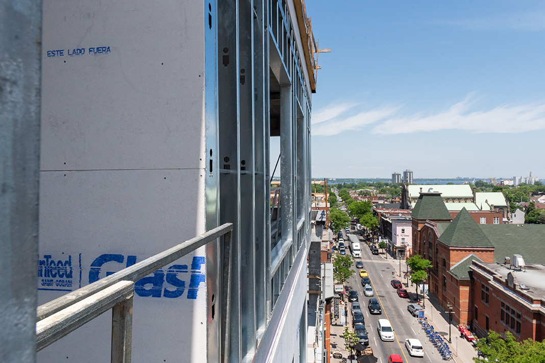 Passersby now watch the artist’s rendering become a reality, day by day. As of June 2018, the structure is in place and the final roof membrane is being applied. Other work—including steel studs, windows, drywall framing, electrical and mechanical—is close to half finished. When the first residents move in, likely at the beginning of March 2019, it will bring one of the first major new construction projects in the revitalized James Street North neighbourhood to completion—to much acclaim.